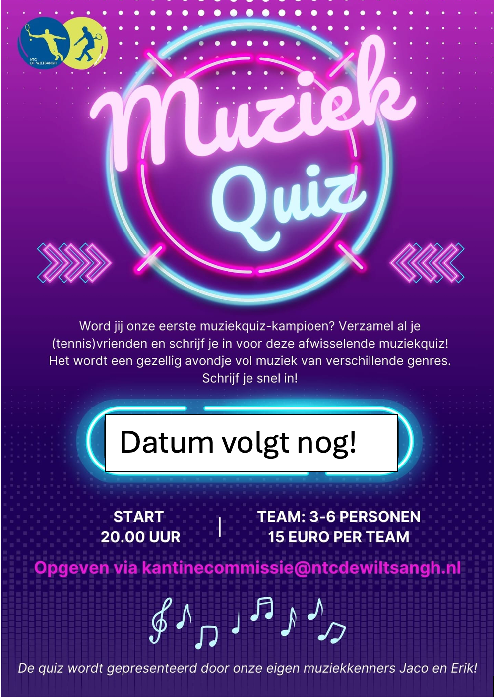 Schrijf je snel in door te reageren op de verzonden e-mail. Inschrijven kan tot en met 24 januari en dit kan in teams van 3 tot 6 personen. Alle teamleden kunnen leden zijn van NTC de Wiltsangh, maar je bent ook van harte welkom om vrienden of familie mee te nemen. Houd er rekening mee dat elk team minimaal 1 lid van onze tennisvereniging moet bevatten. Het inschrijfgeld bedraagt slechts 15 euro, wat een kleine prijs is voor een avond vol entertainment.
