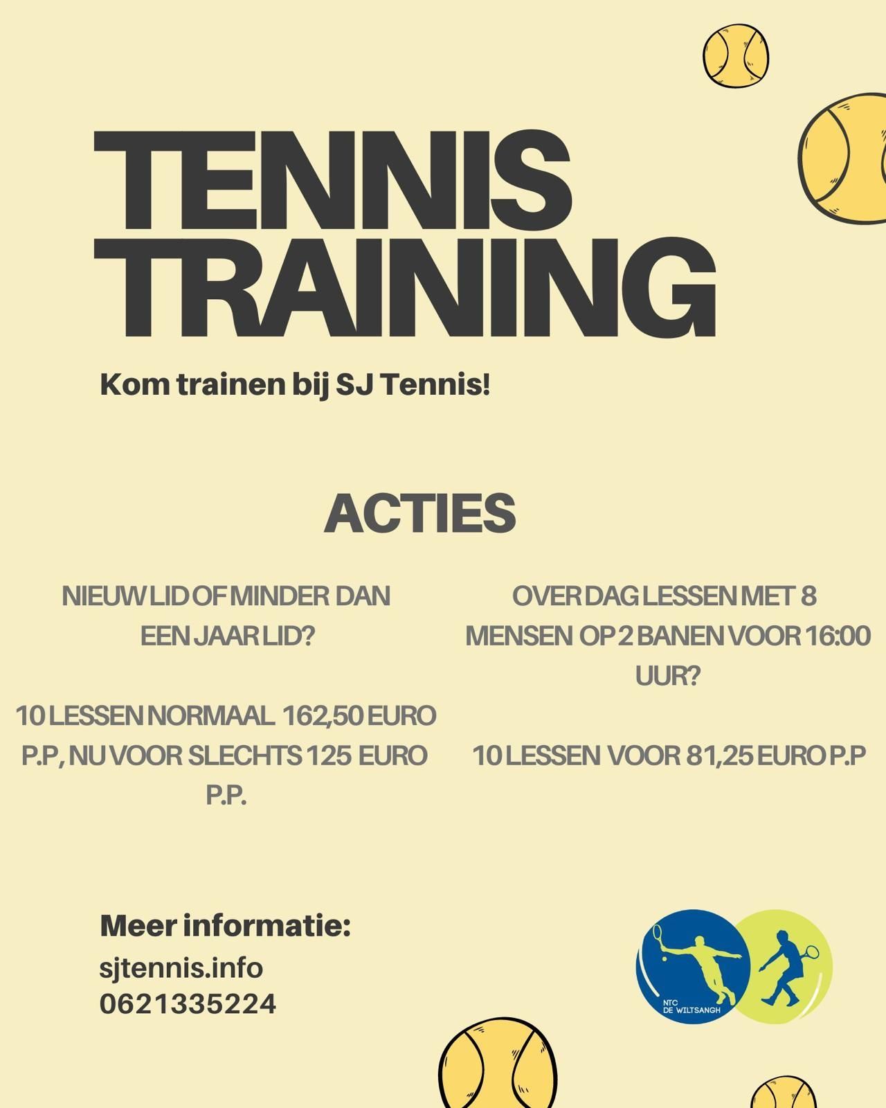 Iedereen is van harte welkom om tennislessen te volgen bij SJ Tennis. Of je nu een beginner bent of een ervaren competitiespeler, iedereen wordt ingedeeld op de juiste speelsterkte zodat jij op jouw niveau kunt tennissen.